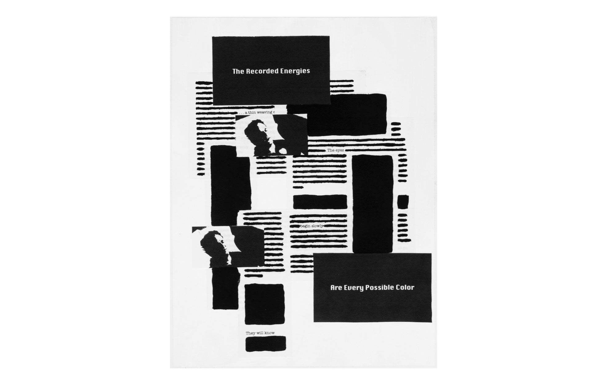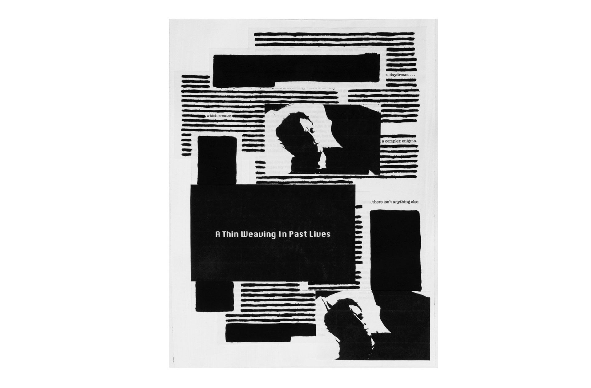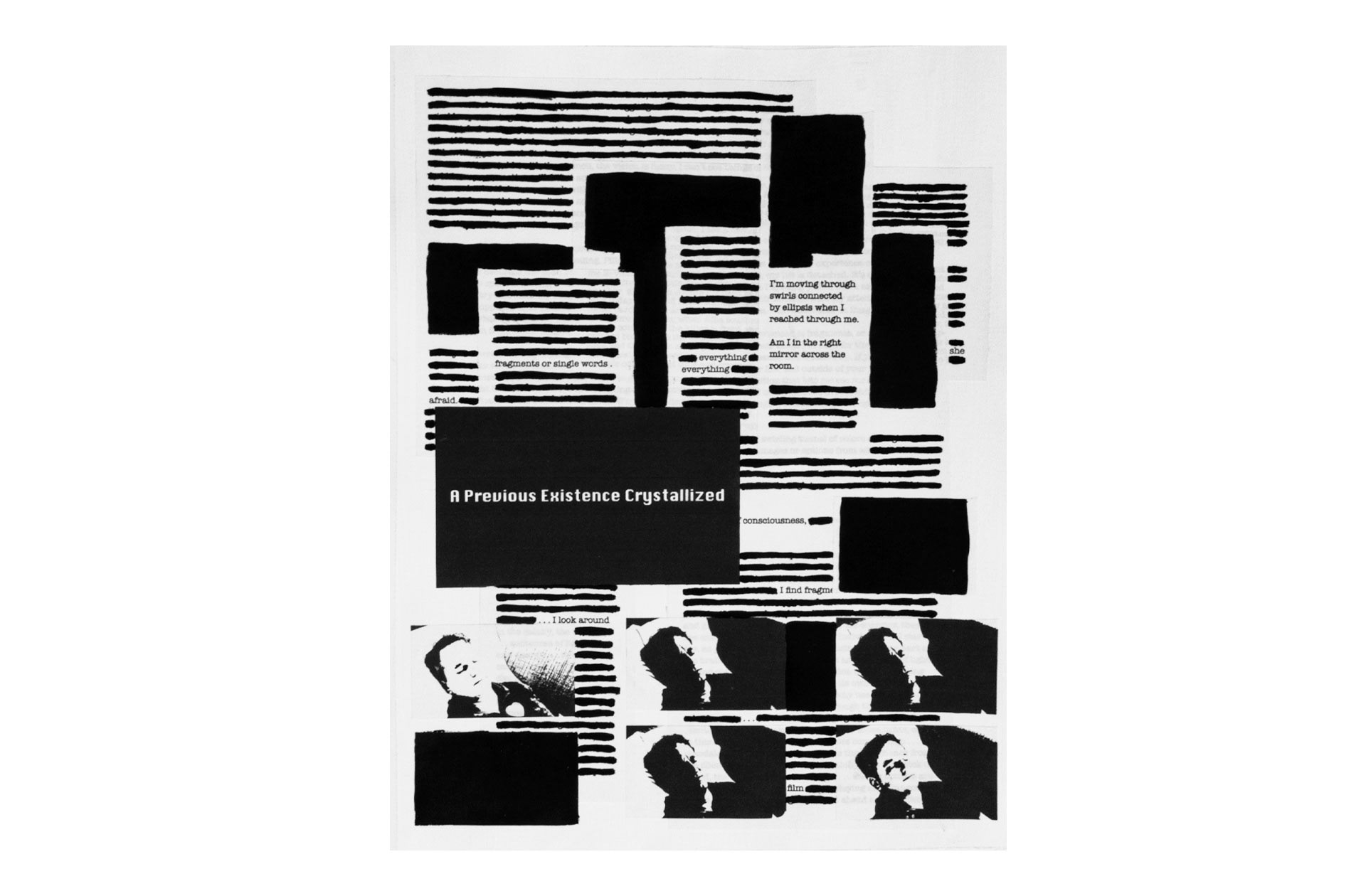These collage works are a selection from a series that combines an experimental cut-up text with video stills in a layout format.